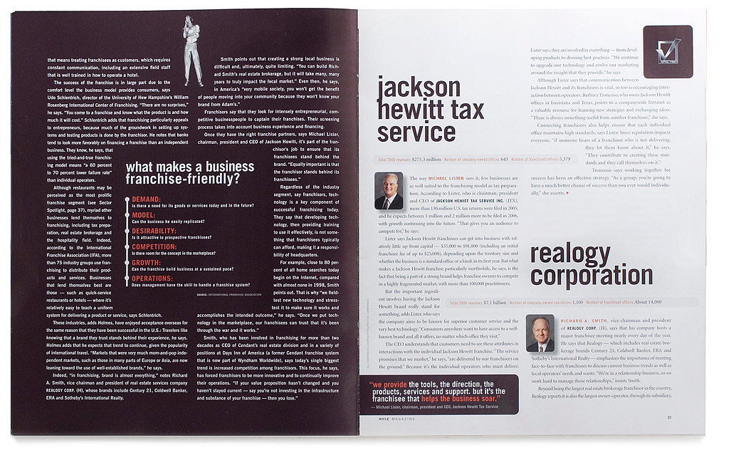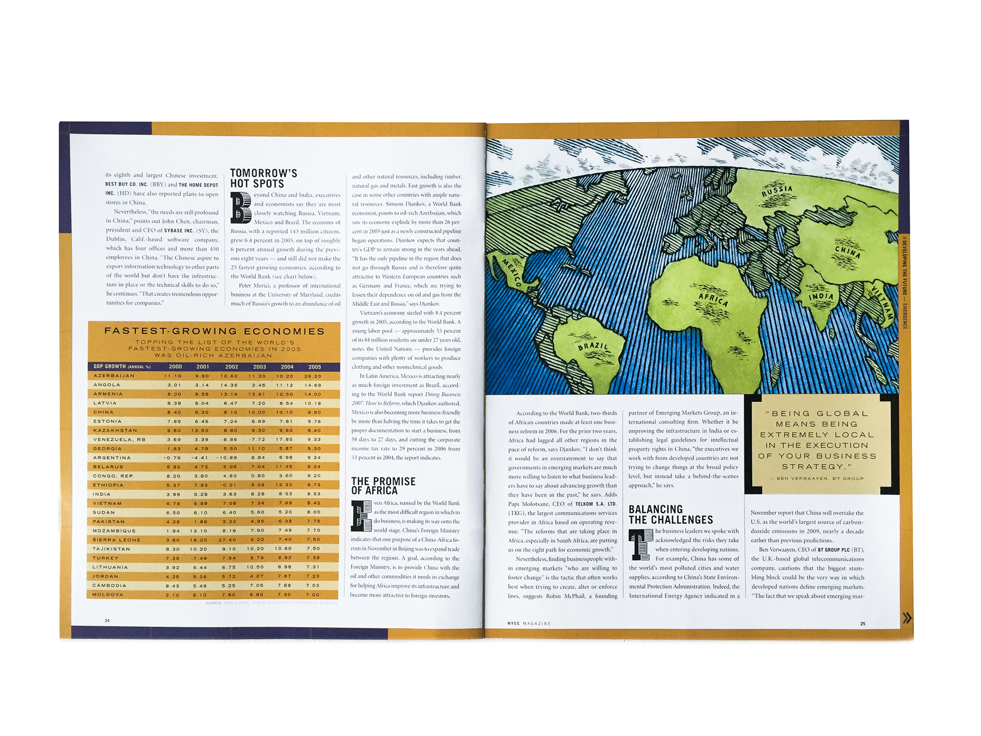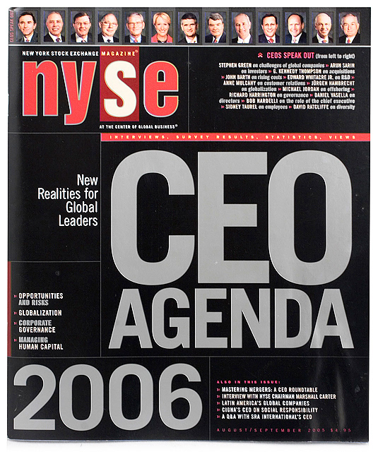 NYSE Magazine was a print publication produced by the New York Stock Exchange that focused on financial markets, major companies, leadership profiles, and business innovation tied to Wall Street and the broader global economy. The magazine featured in-depth interviews with CEOs, economic analysis, and stories about companies listed on the NYSE. Its aim was to highlight the significance and current events of the exchange, promote thought leadership, and foster connections among leading business professionals.